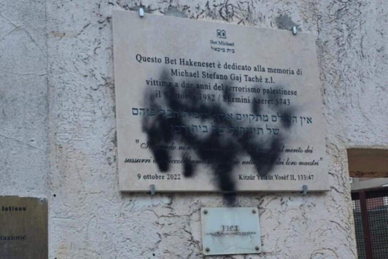 The perpetrators spray-painted the plaque commemorating Stefano Gaj Taché, who was murdered by Palestinian terrorists in an attack on the Great Synagogue of Rome. The plaque was affixed to the wall of another synagogue, Beth Michael.